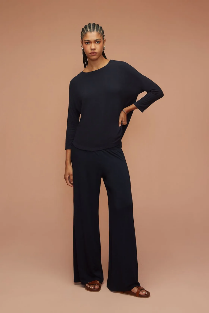Calça Pantalona Marinho Bambu Lastex Deva que traz um toque suave e delicado, respeitando a forma do seu corpo e unindo conforto ao caimento impecável.